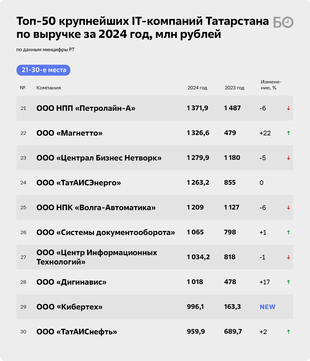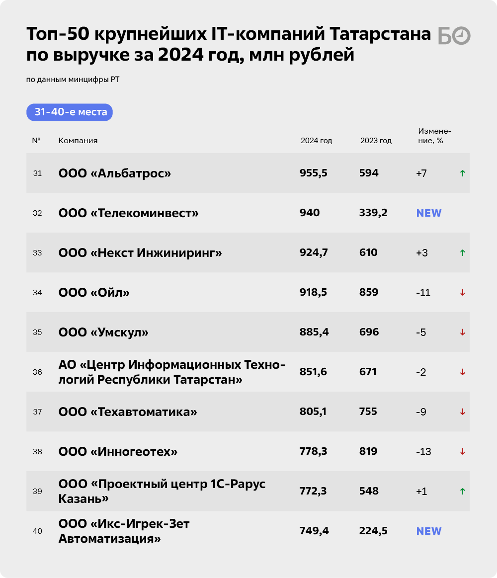 Из немногочисленных выбывших участников — альметьевский «Форт-Консалтинг», созданный под крылом нефтесервисного холдинга «ТаграС», чья выручка упала до 219,4 млн рублей. Покинул рейтинг и резидент ОЭЗ «Иннополис» — «Иннодата» — с выручкой в 170,6 млн рублей (в 2023 году было больше 602 млн). Челнинский «Фавор ИТ» закончил 2024-й с выручкой в 414,6 млн рублей, что также не позволило ему попасть в топ-50. Немного не хватило для попадания в топ и научно-техническому центру «Татнефть» (выручка — 508 млн рублей), прописанному в Бугульме, с шикарным зданием в «Сколково».