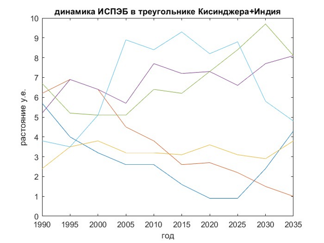 На графике реальная и прогнозная динамика стратегической близости стран в треугольнике Россия – Китай – США с учетом фактора Индии. Искусственный интеллект (ИИ) назвал это «Индекс стратегической политическо-экономической близости стран». На рисунке голубая кривая — Россия и США. Синяя — Россия и Китай. Желтая — Россия и Индия. Зеленая — Китай и США, фиолетовая — Китай и Индия, красная — США и Индия.