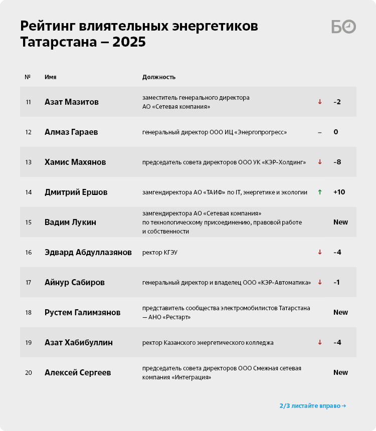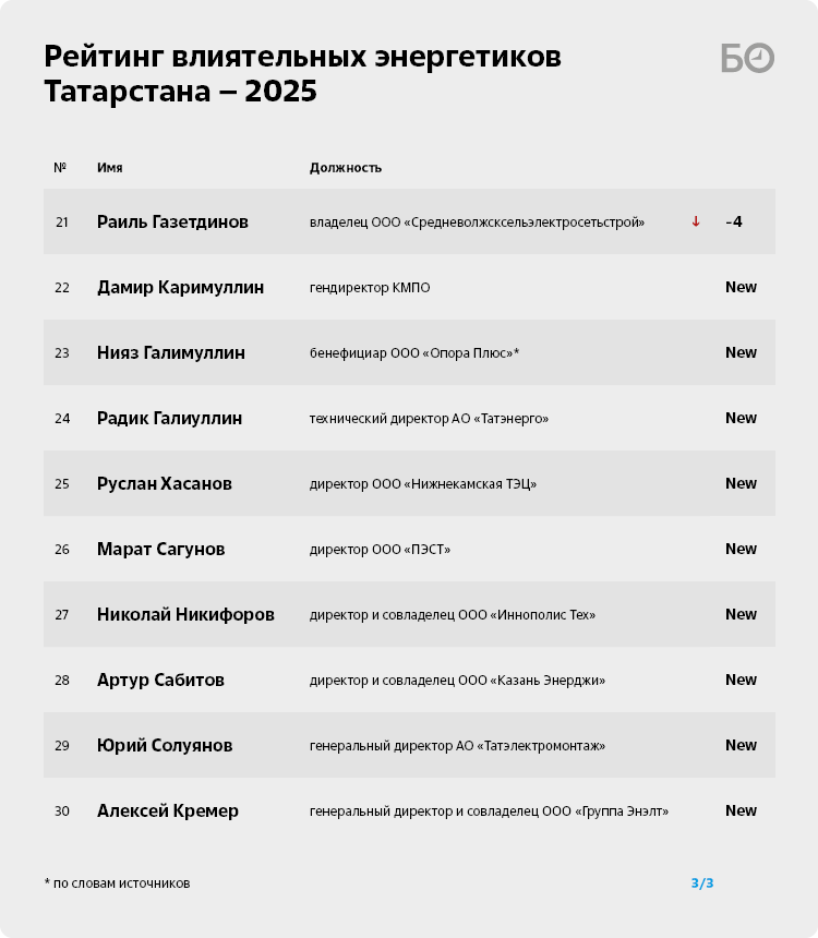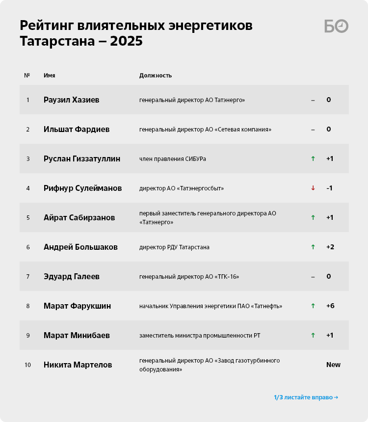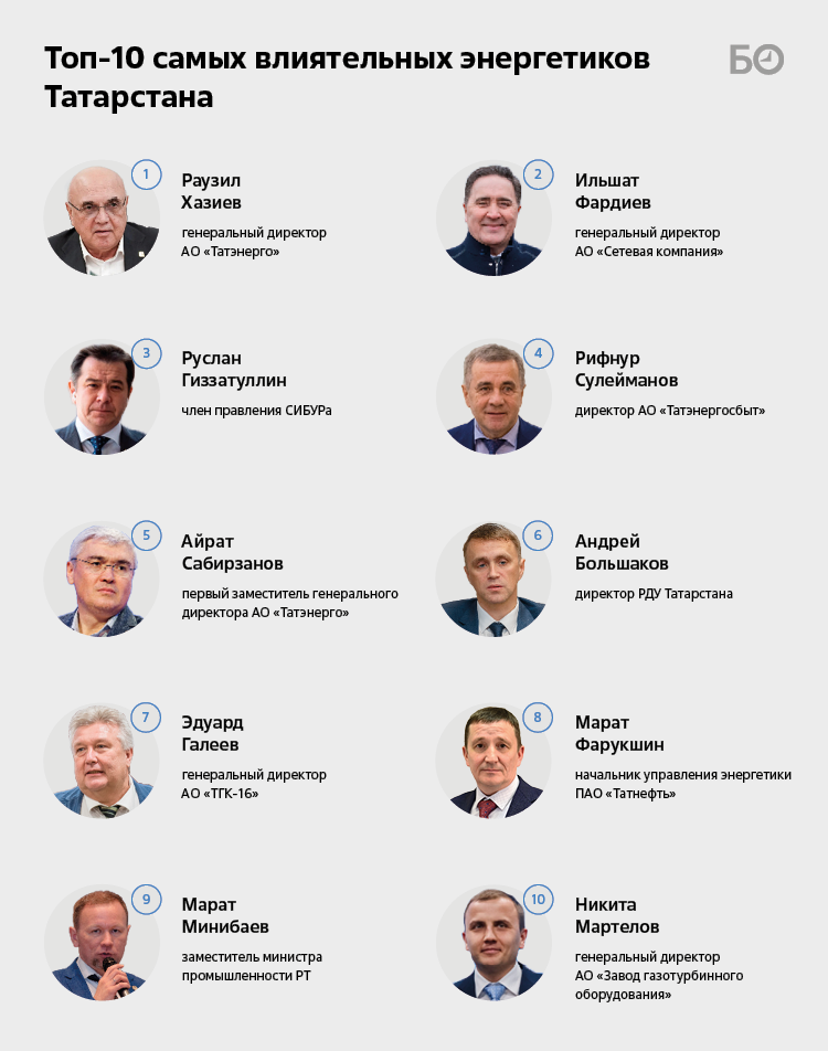 Как эта спираль раскрутится в реальности, узнаем в будущем. А пока предлагаем читателям познакомиться с наиболее влиятельными представителями энергетического сектора Татарстана. При составлении рейтинга влияния игроков мы на условиях анонимности пообщались с многочисленными экспертами — менеджерами компаний, чиновниками и инсайдерами отрасли.