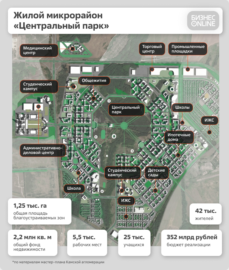 Источники «БИЗНЕС Online» называли тогда сумму инвестиций в 150 млрд рублей, но теперь известна более точная цифра. На настоящий момент, по данным мастер-плана, бюджет реализации — до 352 млрд рублей. Общий фонд недвижимости составит 2,2 млн кв. м, указано в мастер-плане Камской агломерации. Одних только квартир предполагается 13,2 тыс. штук.
