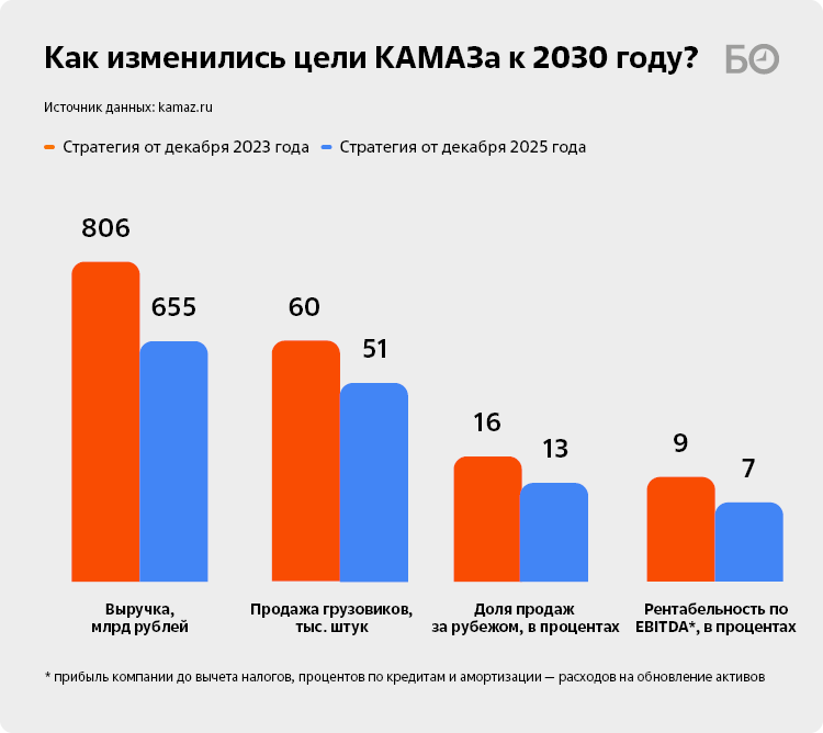 Сегодня днем КАМАЗ представил обновленную стратегию до 2030 года, в которой снизил цели по выручке и продажам на 15–20%. К примеру, теперь завод ориентируется на задачу в 51 тыс. проданных грузовиков к 2030-му, а ранее закладывали показатель в 60 тысяч. Предыдущая стратегия вышла в конце 2023 года и рынок сложился даже хуже, чем заложенный в ней пессимистичный сценарий, объясняет генеральный директор КАМАЗа Сергей Когогин. Главным риском на горизонте пяти лет компания видит усиление конкуренции. А в этом году планирует продать столько же, сколько в прошлом, — 35 тыс. машин. Падение продаж на рынке компенсирует рост поставок по гособоронзаказу, поясняет источник «БИЗНЕС Online».