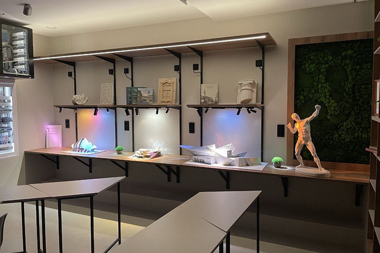 «Лаборатория „Яктылык“ — уникальное экспериментальное пространство, оснащенное современным оборудованием для исследования взаимодействия световых потоков с различными материалами и поверхностями, — говорит доцент кафедры архитектуры, координатор центра от КГАСУ Алексей Иванцов. — Лаборатория позволяет проводить практические работы по проектированию освещения в помещениях различного назначения: выставочно-музейные, торговые, учебные, жилые и т. д., используя при этом как полноформатные образцы источников света и поверхностей, так и зону прототипирования с миниатюрными светильниками и макетами будущих зданий и интерьеров. Зонирование НОЦ проведено таким образом, чтобы охватить различные аспекты световых сценариев в интерьерах зданий: контровая, заполняющая и акцентная подсветка декоративных отделочных материалов и объемных элементов, подсветка трехмерных стеновых панелей, локальное освещение выставочных витрин и стендов, „игра“ освещения с отражающими и прозрачными поверхностями, освещение узких коридоров и многое другое. Точечная и плавная настройка каждого светильника позволяет не просто демонстрировать световые эффекты, но и проводить полноценные лабораторные и практические работы по исследованию влияния типов источников света, температуры их освещения и кривых силы света на визуальное восприятие как интерьера в целом, так и отдельных его элементов».