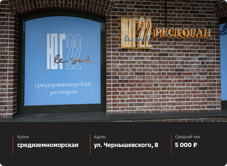 В конце сентября (спустя четыре года) на Чернышевского закрылся More & More — первый в Казани ресторан холдинга Alba Group — преемника Bulldozer Group. На его месте открылся другой проект этого же холдинга — средиземноморская кухня «Юг 22». Точка в столице РТ стала третьей в России — первые две работают в Москве и Санкт-Петербурге. Концепция построена вокруг идеи путешествия по 6 странам Средиземноморья. В заведении представлены raw bar с морепродуктами и тартарами, стартеры и аппетайзеры (маленькие закуски, которые подают перед большим блюдом). На горячее: лосось в томатной глазури — 2 тыс. 390 рублей, осьминог с соусом ромеско — 2 тыс. 690 рублей, язык с пюре — 1 тыс. 860 рублей. Спагетти с морепродуктами — 2 тыс. 150 рублей, орзо со стриплойном — 3 тыс. 600 рублей. Стоимость «сладенького» варьируется от 990 до 1,5 тыс. рублей. К блюдам подают обширную винную карту Старого и Нового света.