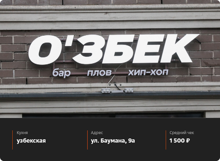 В «Казанском подворье» на Баумана открылся бар Дамира Газизова, одного из совладельцев баров More, Zero, кафе «Утро» и ресторана «Сказки о солнце». Основа меню O’zbek — блюда узбекского стритфуда: плов, манты и самса из большого тандыра. За коктейльную карту, которая строится на специях, отвечает Лионел Рабеаривелу — российский бармен с 10-летним опытом в индустрии, ранее работавший в одном из модных баров питейной столицы страны.