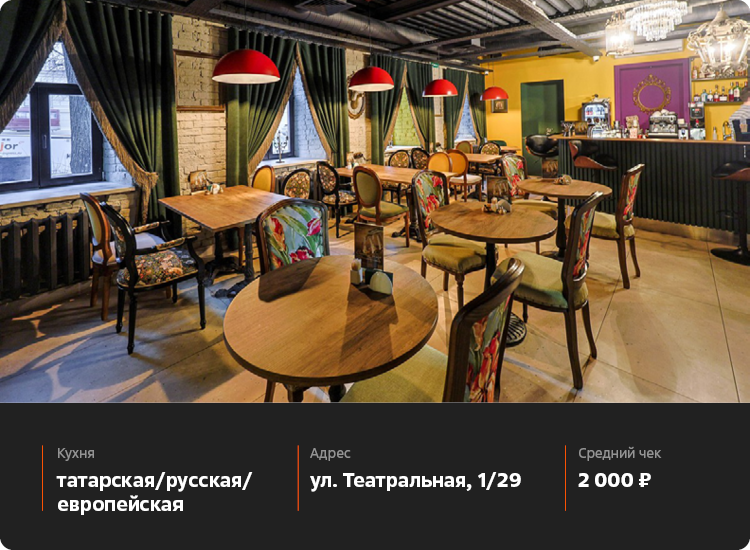 Кафе «Историка» на Театральной находится в особняке XIX века напротив театра оперы и балета. На собственном сайте заведение описывает себя как «очаровательную тему с параллакс-эффектом, идеально подходящую для кофеен, баров и пекарен», обещает «интимную и расслабленную атмосферу» и некие «авторские interpretations». Пространство камерное, но с большими окнами, откуда видно исторический центр. Внутри — теплые оттенки, потертое дерево и старинные стены. Декор собран из предметов разных эпох: барельефы (изображение, слегка выступающее над плоской поверхностью), самовары, картины в разнокалиберных рамах, массивные люстры и светильники из розового металла и текстиля с бахромой. В меню соседствуют европейские, азиатские и татарские позиции. На закуску предлагают тартары и легкие овощные салаты, из горячего — блюда из теста в разных национальных вариантах: манты, пельмени, димсамы, момо. Подают традиционный чак-чак и сладкие гедза.