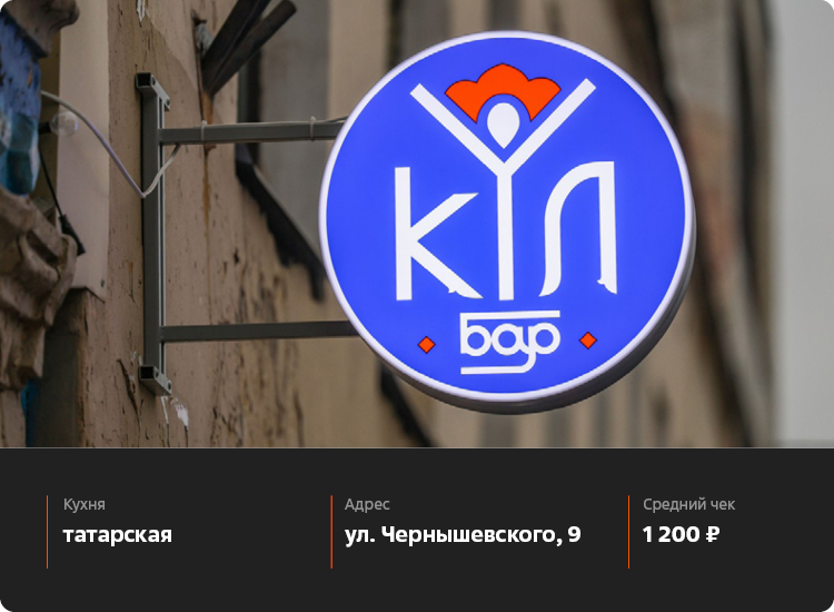 Татарский бар «Кул» на Чернышевского Алексей Костин открыл вместо бара «Паранойя». Интерьер там необычный: оголенная кирпичная кладка и нарочито «облупившиеся» стены на контрасте с ярко-синим потолком, по которому проходят красные вентиляционные трубы. Винтажная мебель, старые комоды, разномастные диваны — все это создает атмосферу богемной, хаотичной квартиры творческого человека. Меню емкое, с явным татарским акцентом. Ценник на еду более чем демократичный. На горячее подают полбу с кониной и мисо-каймаком, азу на современный лад — с бататом, утиную грудку с вишней, имбирем и свекольными чипсами — все по 440 рублей. Фри с трюфельным соусом — 290 рублей, креветки фри с каймаком том-ям. Сладкая нота — штрудель с карамельными яблоками, хворостом и… снова мисо-каймаком. Не удивляйтесь, если решите заказать его: десерт визуально похож на панкейки.