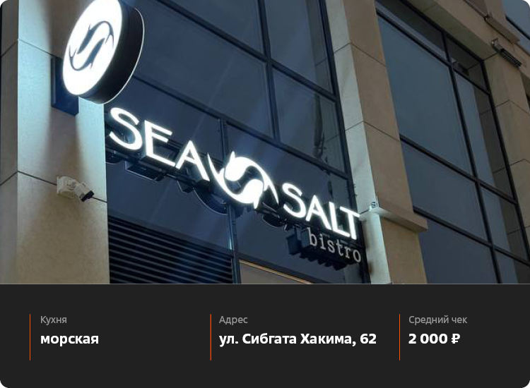 Еще одна новость ЖК Uno — открытое в техническом режиме «городское морское бистро». Это заведение команды Olio — Ольги и Тимура Хайрутдиновых, которой принадлежат рестораны Olio, «Энием» и «Толока». В Sea Salt детализированный интерьер в морском стиле, где на стенах светильники в форме морских ракушек или веерообразных раковин моллюсков, фигурки в виде скатов, рисунки гладкой поверхности воды и нечто похожее на мрамор, напоминающее чернила каракатицы. На закуску в бистро подают обожженый стриплойн на лепешке роти с соусом понзу и фиолетовой горной солью — 550 рублей, крудо из сибаса — 690 рублей, икру лосося с бриошью — 750 рублей. На горячее: паэлья с морепродуктами, палтус с трюфельным пюре и пирог с креветками. Еще в меню есть 8 видов ручных роллов. Средний чек — 2 тыс. рублей.