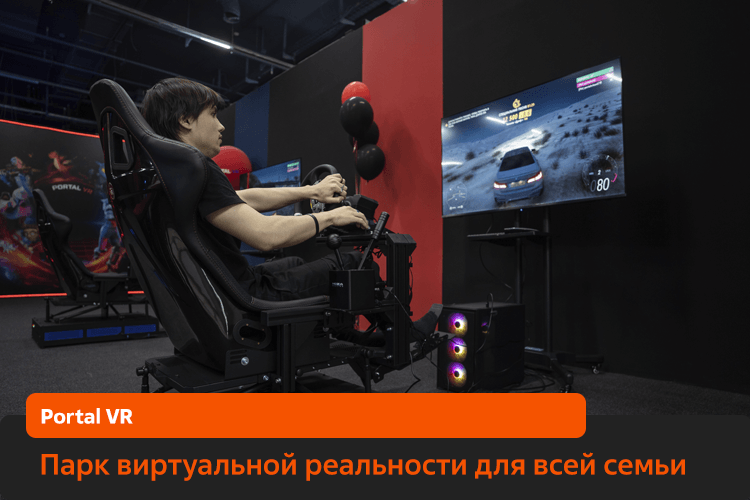 - Portal Drive***. 2 автосимулятора с профессиональным гоночным игровым оборудованием. Благодаря подвижной платформе вы ощутите всю сложность трассы на себе: подпрыгивание на кочках, вибрации руля от разгонов и столкновения. Можно гонять по трассам самостоятельно или соревноваться с друзьями.