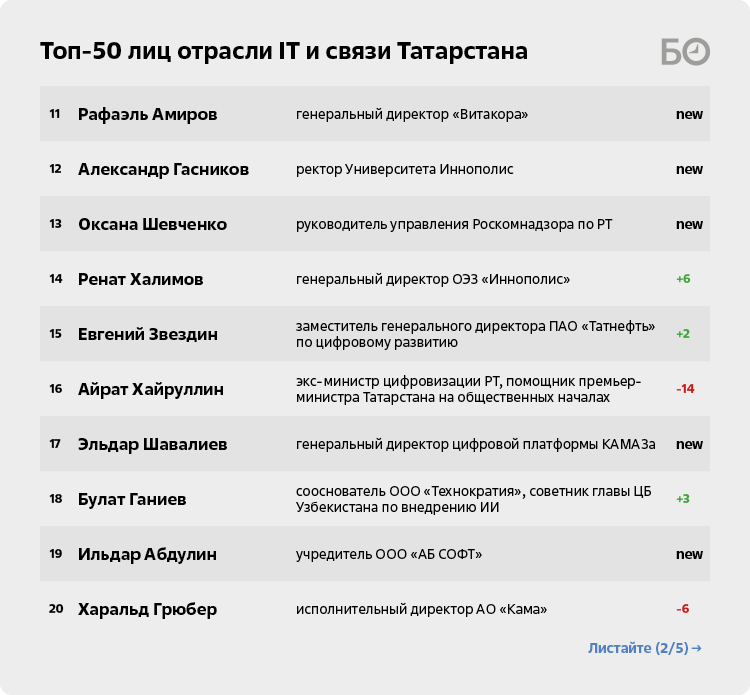 В сентябре 2025 года Илья Начвин (№4) сменил на посту министра цифрового развития Айрата Хайруллина (№16). Дебютная коллегия первого в январе 2026-го получилась амбициозной: программа развития ИИ на пять лет с бюджетом 1 млрд рублей ежегодно. В условиях жесточайшего дефицита бюджета для молодого министра защита такого инвестпроекта — это колоссальная победа. «Кто завтра не будет работать с ИИ — окажется неконкурентоспособен. Последнее выступление главы NVidia стало популярнее многих рок-концертов, люди забили весь зал и слушали стоя. У нас такого уровня визионеров, увы, не наблюдается. Американцами уже управляет ИИ: война в Иране — тому пример. Технология отдаляет страны, компании и людей — по мышлению, эффективности и подходам к решению задач; разрыв станет непреодолимым. Поэтому Начвин — молодец, что занялся этой историей, хотя на выходе красивого IT-парка, куда можно водить экскурсии, не получится», — говорит один из ведущих IT-игроков. Что ж, с ИИ начало положено, теперь предстоит его довести до конца.