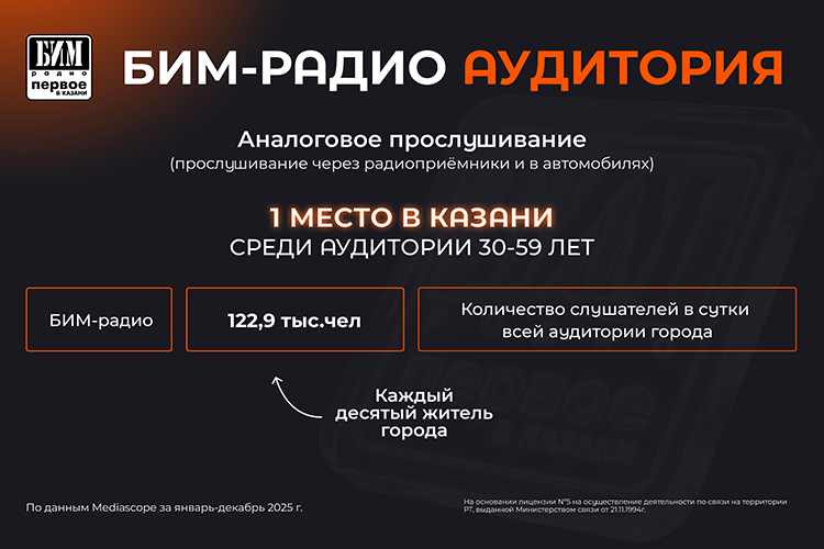 За 30 лет казанское БИМ-радио выросло из локальной станции в мультимедийную платформу с ежедневной аудиторией более 300 тыс. человек и теперь объединяет эфир, соцсети и живые мероприятия в единую рекламную экосистему. Ее ядро — самая платежеспособная аудитория: люди от 30 до 59 лет, которые доверяют любимым ведущим и проверенному десятилетиями медиа. О том, почему радио не только выжило в эпоху «цифры», но и стало эффективнее, читайте в статье.