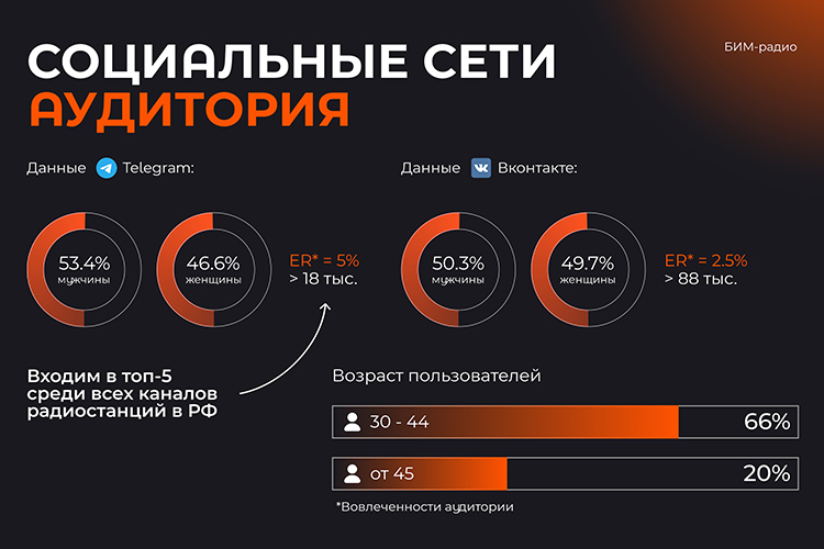 Ежедневная аудитория БИМ МЕДИА сегодня — более 300 тыс. человек, включая все каналы. По суммарным показателям вовлеченности в социальных сетях БИМ-радио входит в топ-5 среди всех радиостанций России (согласно данным исследовательской группы «Центр развития новых медиа», сентябрь – декабрь 2025 года). Ежедневно слушатели БИМ-радио присылают более 500 сообщений в соцсети станции, превращая эфир в живой диалог.