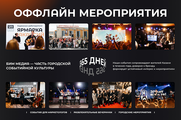 Еще один яркий пример — «Ярмарка вакансий», проект, организованный БИМ МЕДИА, который объединил в себе развлекательную программу с хедлайнером — музыкантом Раилем Арслановым («Хижина музыканта»), образовательные лекции о трудоустройстве от сервиса по подбору персонала hh.ru и розыгрыши крупных призов. По отзывам работодателей, некоторые из них собрали до 100 резюме за один день. «Партнеры говорили: мол, мы ни на одной кадровой ярмарке такого не видели. Около каждого стенда собиралось огромное количество людей. Все пытаются что-то спросить, узнать, записаться. Мы оживили старый формат», — говорит Эльвира Копылова.