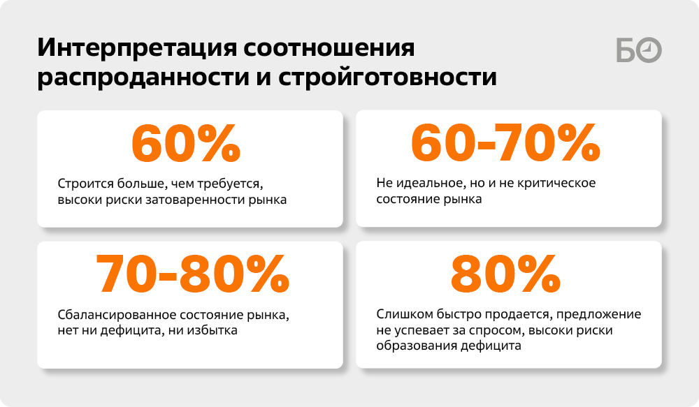 Сами застройщики чаще смотрят не только на значение распроданности, но и на его соотношение со стройготовностью. Оптимальным считается 70–80%. Все, что выше этих цифр, говорит о дефиците предложения: квартиры покупают слишком быстро. А если соотношение ниже — значит, высоки риски затоваренности.