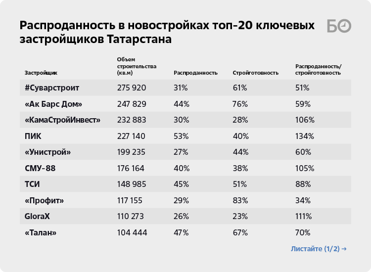 Что ж, взглянем на текущие показатели у 20 крупнейших застройщиков, дающих сегодня почти 80% объема жилищного строительства в республике (2,4 млн кв. м).