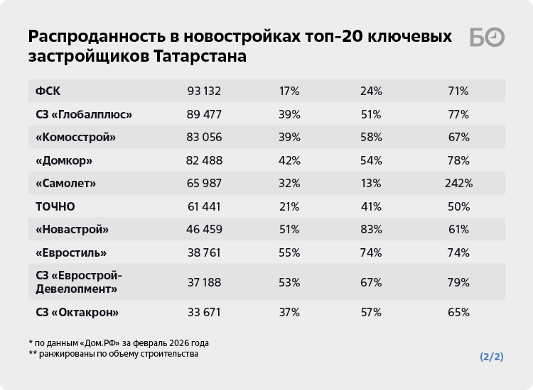 «Стоит учитывать, что показатели распроданности в ЕИСЖС не в полной мере отражают фактический объем сделок, так как в них не учитываются рассрочки — например, в феврале их доля в наших проектах составила порядка 67 процентов», — пояснили «БИЗНЕС Online» в «КамаСтройИнвесте». Высокую долю рассрочки в своих проектах они объясняют ограниченностью ипотечного кредитования.