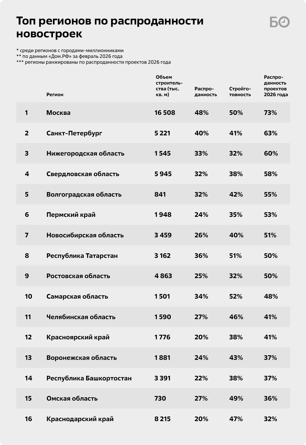 В среднем по стране ситуация выглядит несколько хуже: не распродано 68% новостроек. Если посмотреть данные по 16 регионам с городами-миллионниками, то Татарстан с 36% проданных квартир окажется в тройке лидеров наряду с Москвой (продано 48%) и Санкт-Петербургом (40%). А наибольшая доля невостребованных квартир — в теплом Краснодарском крае, где, впрочем, огромный объем строящегося жилья (8,2 млн кв. м). Тяжело и в Башкортостане, где доля проданных «квадратов» — 22%. В целом ни в одном регионе с городами-миллионниками не продано и половины строящихся новостроек, в среднем доля «плавает» у отметки 30%.