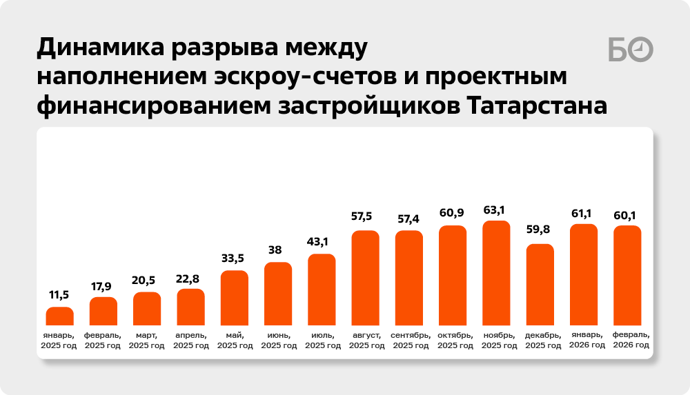Примерно так оно и было. Например, в относительно благополучном ноябре 2024 года кредит татарстанских застройщиков был равен сумме денег, полученных за квартиры. Но с тех пор «кассовый разрыв» увеличивается. К марту разница между суммами кредитов на строительство и поступлениями от проданных квартир на эскроу-счетах превысила 66 млрд рублей, или 24% от задолженности. За месяц разрыв вырос на 3 млрд рублей. Всего застройщики должны банкам примерно 272 млрд рублей, а на эскроу-счетах ЦБ показывает около 206 миллиардов.