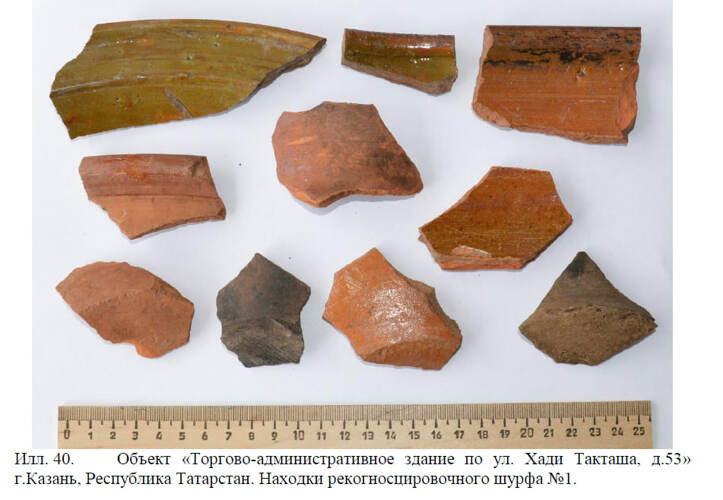 Найденный культурный слой Архангельской слободы XVIII–XIX веков находится на склоне правого берега озера Нижний Кабан на ул. Хади Такташа, 53. Обследуемый участок предназначался под строительство торгового-административного здания площадью 680 кв. метров. Там сейчас располагается старый деревянный дом и полуразрушенное каменное строение электрической подстанции. Однако археологи при раскопках обнаружили под землей фрагменты керамики XVIII и XIX веков: 34 фрагмента гончарной красноглиняной керамики и 23 фрагмента гончарной мореной керамики.