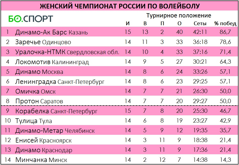 Казанская команда ушла на новогодний перерыв в качестве лидера турнирной таблицы: 13 побед в 15 матчах. Дебютант турнира «Корабелка» занимает 9-е место.