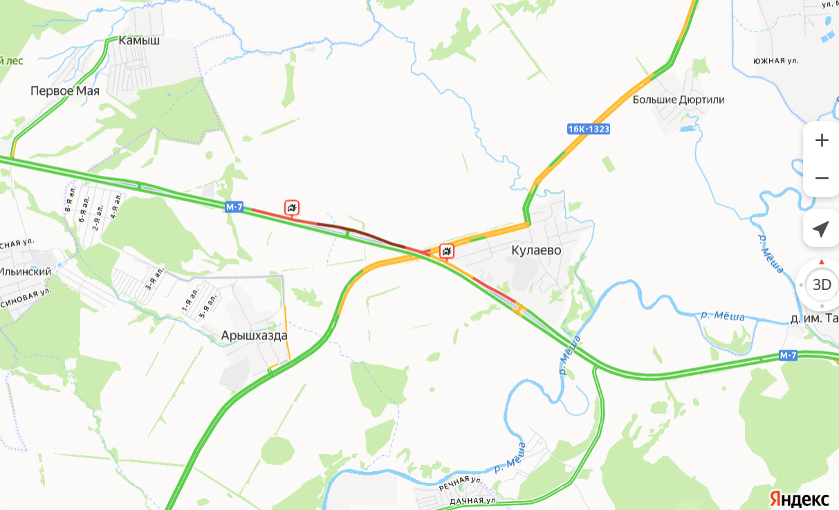 Под Казанью на участке трассы М7 между поселками Кулаево и Первое Мая растянулась пробка протяженностью 4 километра. Об этом свидетельствуют данные сервиса «Яндекс.Карты».