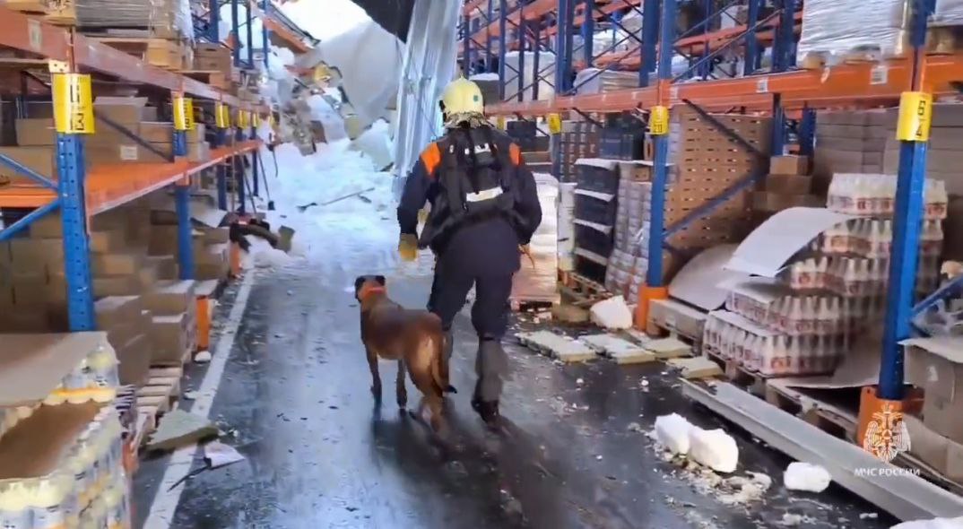 На месте обрушения кровли складского помещения «Магнита» в Зеленодольске продолжают разбирать завалы. К поиску возможных пострадавших присоединились кинологи. Об этом сообщили в ГУ МЧС РФ по РТ в Max.