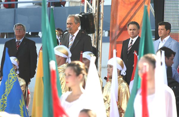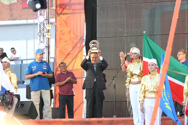 В Казани на площади перед «Татнефть Ареной» состоялась торжественная церемония открытия международного ралли-рейда «Шелковый путь». Участников и зрителей приветствовали Президент Татарстана Минтимер Шаймиев, министр спорта, туризма и молодежной политики России Виталий Мутко, глава госкомитет Туркменистана по туризму и спорту Гурбанмаммет Элясов, директор «Дакара» Этьен Лавинь. В церемонии также приняли участие один из участников гонки в составе команды «КАМАЗ-Мастер» - Премьер-министр РТ Рустам Минниханов, гендиректор КАМАЗа Сергей Когогин, мэр Казани Ильсур Метшин. Фото Марии Зверевой, prav.tatarstan.ru, shaimiev.tatarstan.ru 05.09.2009